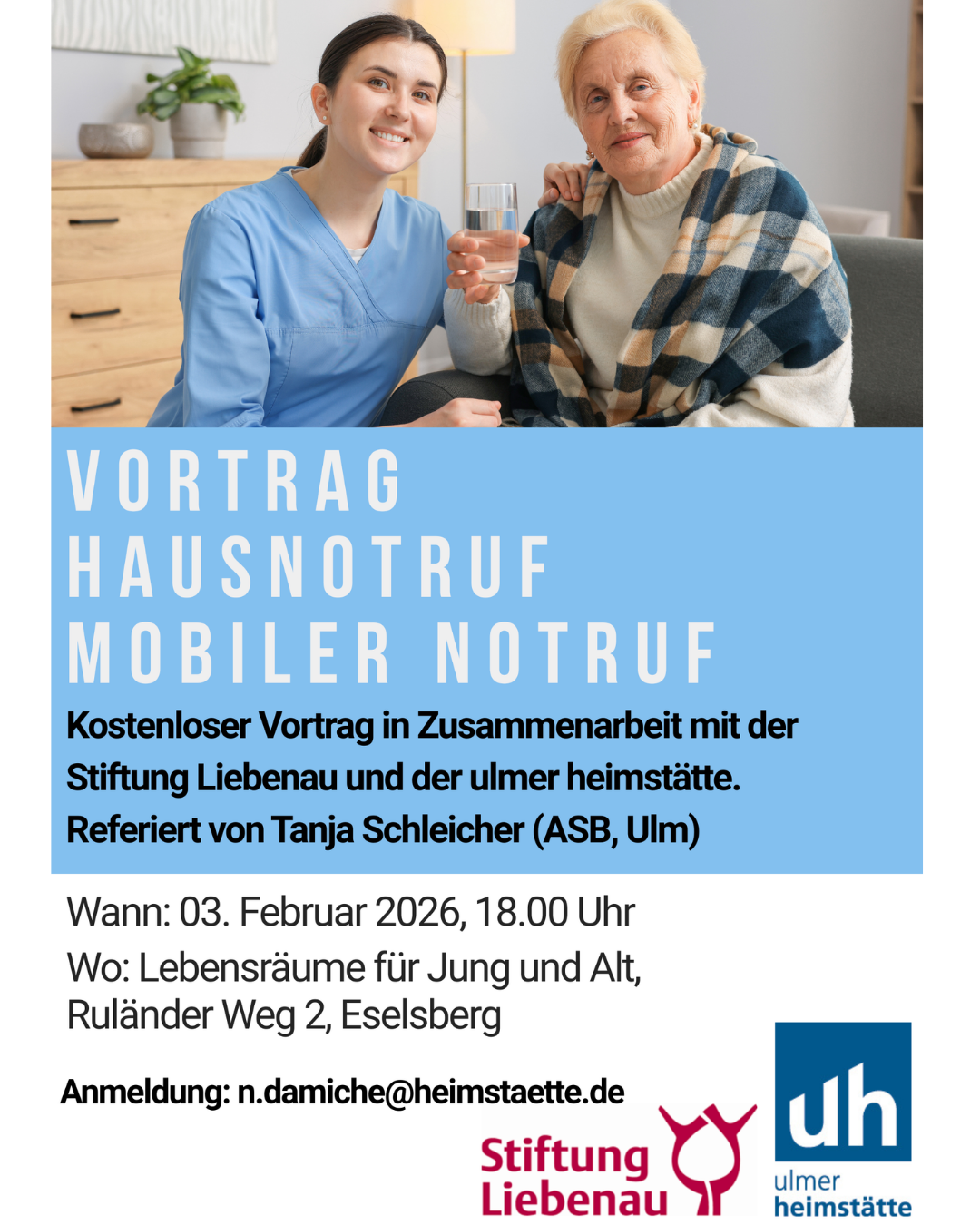 am 03.02.2026 um 18 Uhr findet bei den Lebensräume für Jung und Alt im Ruländer Weg 2 am Eselsberg ein kostenloser Vortrag zum Thema Hausnotruf und Mobiler Notruf statt.