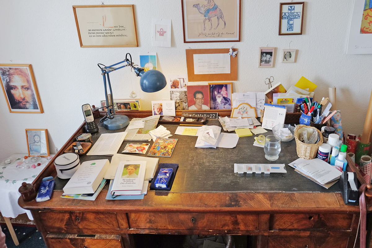 „Behaglich“, damit lässt sich gleichfalls der sehr individuelle Wohnstil des Ehepaares beschreiben. Die meisten ihrer Möbel haben eine Geschichte, sind Familienerbstücke. Die Jugendstil-Eckbank etwa oder die beiden charaktervollen Schreibtische, deren Arbeitsflächen langsam verschluckt werden von diversen Utensilien. Bilder hängen nicht in Reih und Glied, tragen ebenfalls viele Erinnerungen in sich. Die Regale quellen schier über vor Büchern, Musikalien und Accessoires aus allen Herren Ländern und lassen einen weiten Bildungshorizont erahnen.